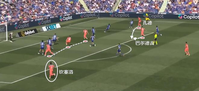 这一次的进攻很典型,巴萨一侧边锋内收时,边后卫就要跟边锋一样拉开宽度。孔德的特点,是更合适边锋拿球后,他无球套上外线接应,所以他相对靠后一点,但不等于说孔德不参与进攻。