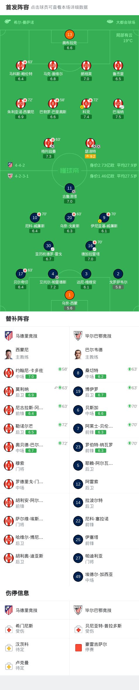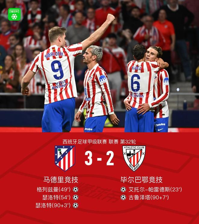 北京时间4月26日西班牙足球甲级联赛 联赛 第32轮,马德里竞技主场对阵毕尔巴鄂竞技。马德里竞技格列兹曼破门,瑟洛特梅开二度。毕尔巴鄂竞技艾托尔-帕雷德斯破门,古鲁泽塔破门。最终比分马竞 3-2 毕尔巴鄂竞技。